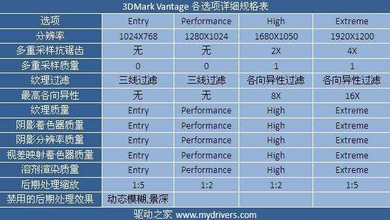 3DMark Vantage中,DX10、SM4.0、物理加速这些新技术第一次得以展现得淋漓尽致,3DMark Vantage还为我们带来了很多新颖的东西,它把测试结果按照画质等级预设划分成了入门级(Entry,E)、性能级(Performance,P)、高端级(High,H)、极限级(Extreme,X)四类,测试必须严格运行在这四套预设模式下;测试结果得分表达方式也改成了字母加数字的组合形式,从而更细致地反映系统性能等级,可以更对位、更公平地进行比较,省去了很多对测试结果再进行说明的麻烦。