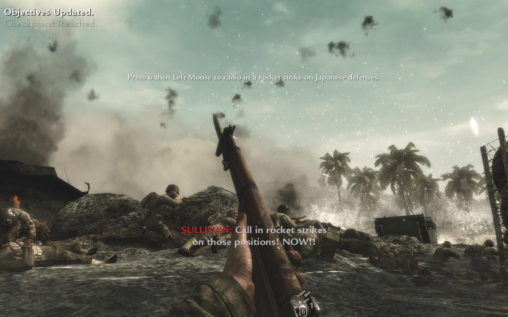 在《使命召唤4:现在战争》之后,《使命召唤5:战火中的世界》又将目光转向了二战,并重点定焦之前从未涉及过的太平洋战场。在该作的大部分剧情中,玩家将扮演美国大兵,在太平洋战场的海岛上与狡猾凶残的日本军展开惨烈争夺战,塞班岛、硫磺岛、冲绳岛等著名太平洋战役都将在这款游戏中有所体现。在该作的另一部分剧情中,玩家将扮演一名年轻的苏军士兵,在欧洲东线战场上坚毅不屈的向着柏林挺进。敌后狙击战、坦克会战、柏林巷站虽然有复制前作之嫌,但是《使命召唤5》却赋予了它们新的感情基调,以更黑暗的视角直面苏德间的恩怨。《使命召唤5:战火中的世界》沿用前作的引擎,仍然是一款DX9游戏,但随显卡要求却不低。