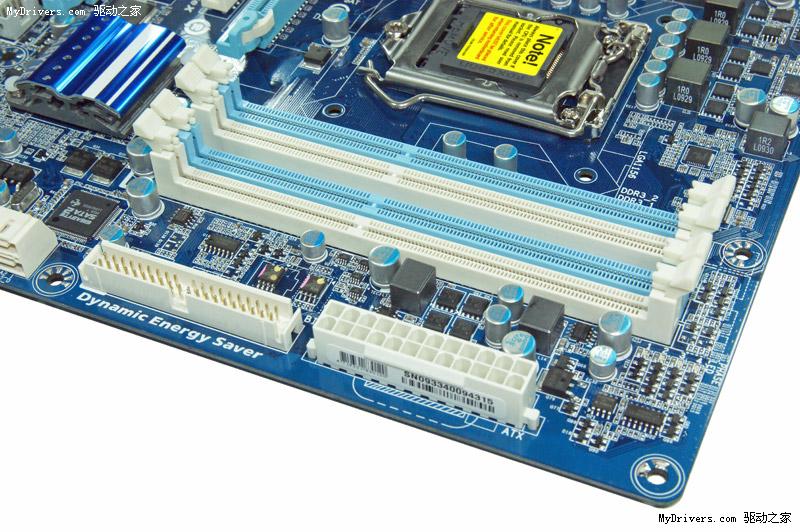 内存部分和UD4基本一致,也是四条双通道DDR3内存插槽、最大容量16GB、两相供电设计,而且如果显卡安装在第一条PCI-E x16插槽内,同样会造成内存插拔的困难。