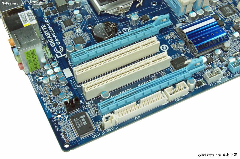 扩展插槽有两条PCI-E x16和两条PCI,也就是把UD4的PCI-E x4换成了第二条PCI。注意两条PCI-E x16只有第一条是完整x16带宽,使用双插槽显卡又会盖住旁边的PCI插槽,而第二条PCI-E x16是P55提供的,带宽仅x4,不建议安装显卡。