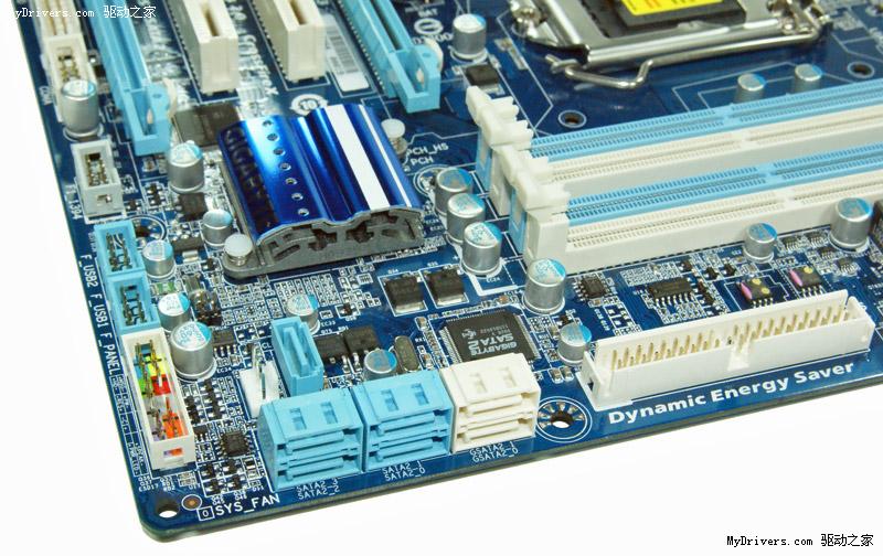 P55芯片组的散热片倒是比UD4多了深蓝色的一层,扩展接口还是七个SATA 3Gbps和一个IDE,不过注意两个白色SATA 3Gbps和IDE的控制器已经从有缺陷的Marvell 88SE9123 6Gbps改为JMicron JMB363 3Gbps。
