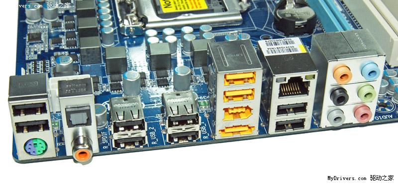 背部输入输出接口和UD4完全一致,以太网卡和IEEE1394a也相同,不过集成声卡换成了Realtek ALC888B,略弱于UD4上的ALC889a。