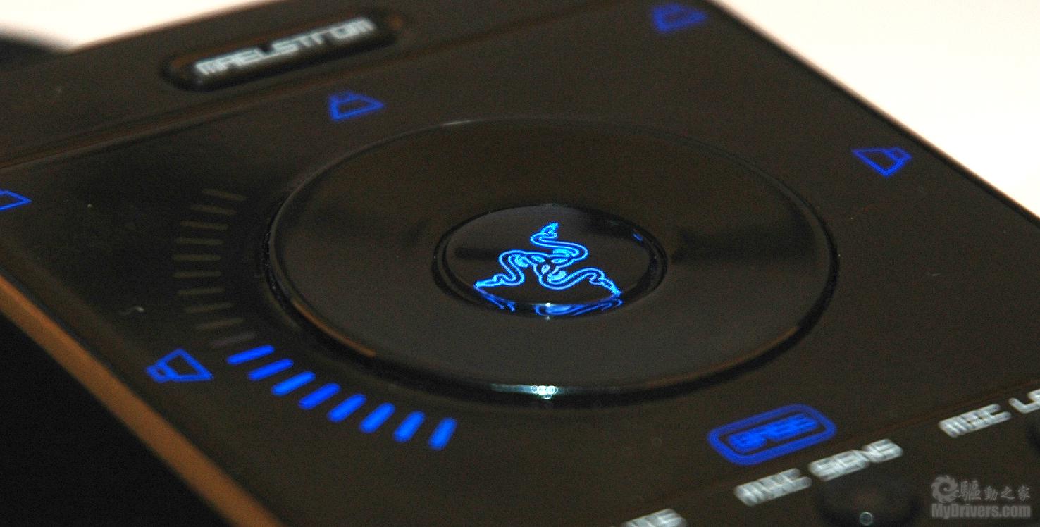 声卡的表面采用了全镜面设计,上面的操控部分除了音量调节均为按钮设计,位于最上方的条形按钮就是2.0音效和7.1音效的切换按钮,而中间部分的原型三头蛇标志的按钮则可以更进一步的对相应的声道进行细节调整,譬如可以只选择7.1声道的两个前置或者中置声道,不过无论如何调整它的指示灯都是常亮的,不会改变颜色的强度。