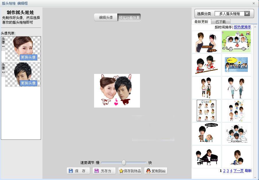 现在,张杰该找到娜娜了。跟前面制作张杰的摇头娃娃一样,进入“动感闪图”。不过这次我们要选择“多人摇头娃娃”,然后再抠图。