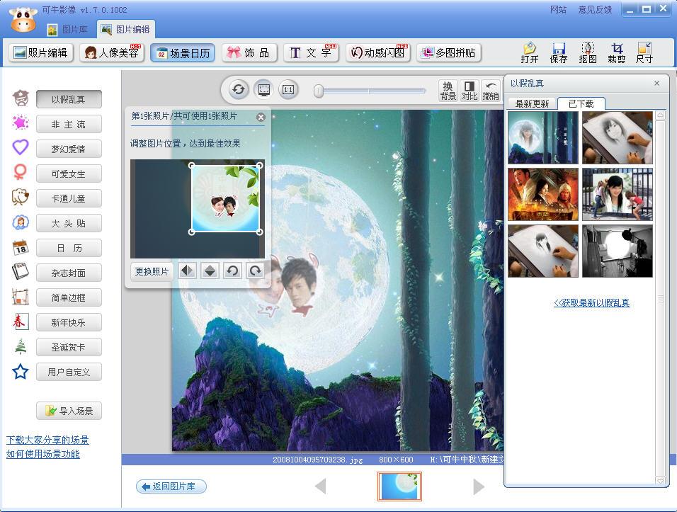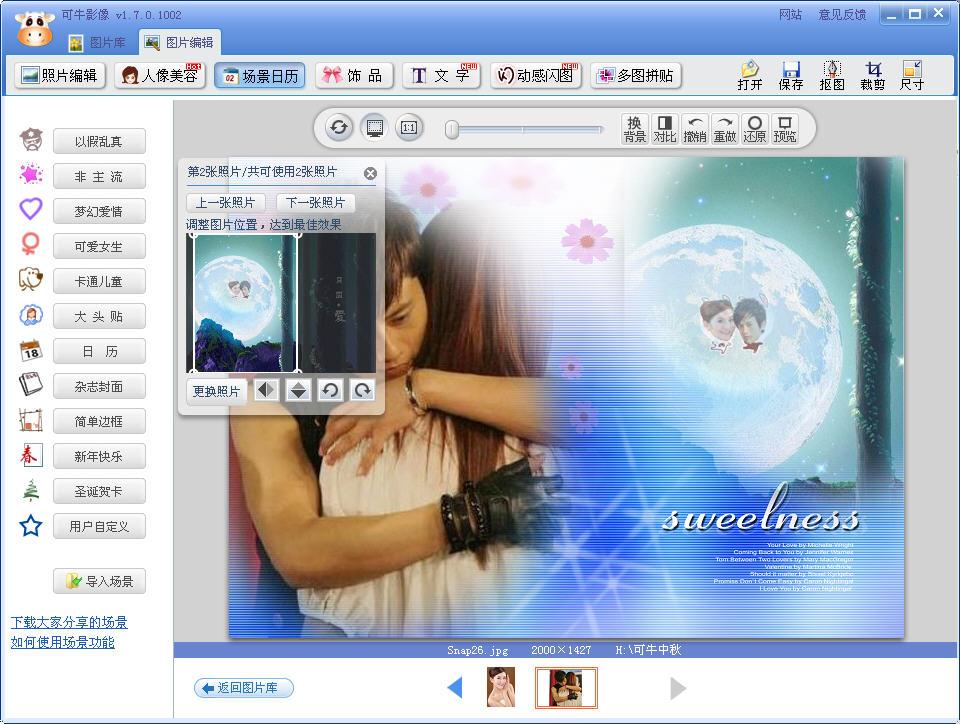 找到了娜娜,怎么能不拥抱一下。小编找到了一个张杰在他的明天过后MV里的图片,正好是张杰紧紧地拥抱着娜娜。还是通过“场景日历”的场景对两张图片进行调整。一张圆满的图片就完成了。对了,最后不要忘记我们的主题,中秋节,加上“但愿人长久,千里共婵娟”几个字,图片是不是更唯美了。