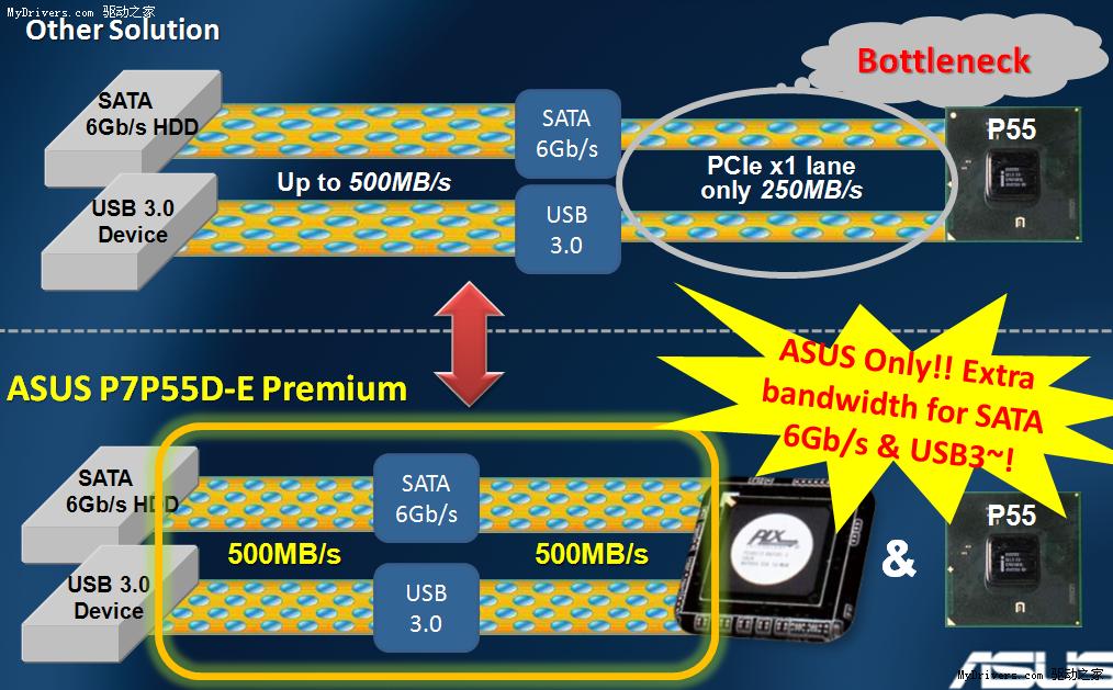 如上图所示,没有使用华硕PEX PLX8613桥接芯片的主板只拥有一半的传输速率,而只有使用了这颗PEX PLX8613桥接芯片,才能真正实现SATA 6Gbps的传输速度,目前拥有这颗芯片的主板只有华硕的P7P55D-E Premium和P7P55D Premium,而真正实现SATA6Gbps和USB3.0规范的主板目前只有华硕不久前发布的P7P55D-E Premium这款主板。