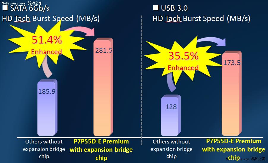 根据测试,拥有PEX PLX8613桥接芯片的华硕P7P55D-E Premium相比其他没有PEX PLX8613桥接芯片的产品,在SATA 6Gbps和USB 3.0的传输速度上分别有51.4%和35.5%的提升。