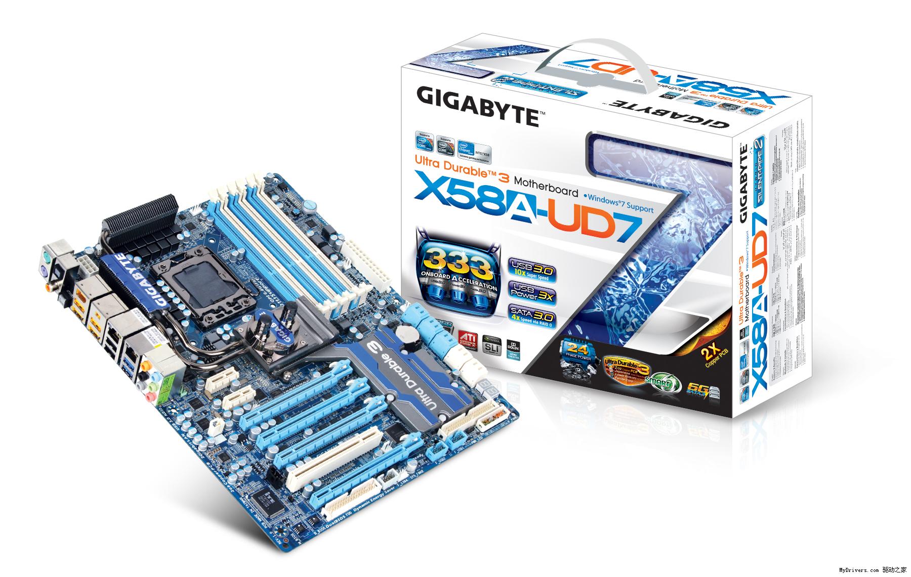 全球顶尖主板、显示适配器和硬件解决方案制造商—技嘉科技,于今天发表首款采用Intel® X58芯片组的GA-X58A-UD7主机版。技嘉 GA-X58A-UD7主板提供所有游戏玩家及高阶用户期待的新一代杀手级功能,包括技嘉的333硬件加速设计如USB 3.0, Serial-ATA Revision 3.0 (6Gbps) 以及 3x USB Power Boost等,同时GA-X58A-UD7也支持包括NVIDIA 3-Way SLI™ 以及ATI CrossFireX™ ,除此之外GA-X58A-UD7更支持英特尔即将问世的32奈米高效能处理器。