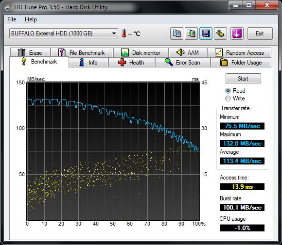 读取测试成绩很不错:平均113.4MB/s、最低75.5MB/s、最高132.0MB/s。