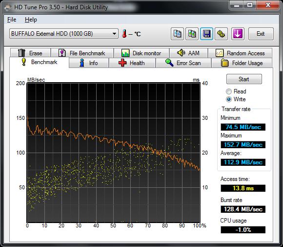 重新测试就正常了:平均112.9MB/s、最低74.5MB/s、最高152.7MB/s,已然超过了标称值。