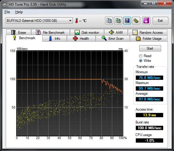 希捷Barracuda XT 2TB率先用上了SATA 6Gbps接口,但性能表现很一般,而Buffalo这款USB 3.0硬盘虽然是外置型的,性能依旧不俗(毕竟USB 2.0也太慢了),读写速度都令人满意,只是由于需要频繁转接,访问延迟有些高,等到今后主板、硬盘都原生支持后相信还会更好。