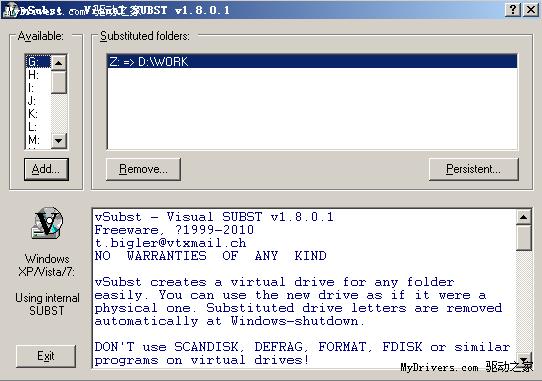 vSubst是一个免费的绿色软件,它的原理就是借用系统的subst命令,软件的界面非常的一目了然,我们可以看到D;\work已经被映射到Z盘。
