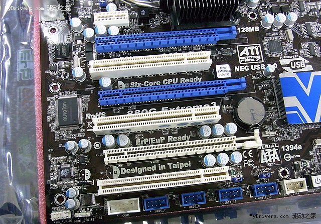 ATX板型,板载128MB DDR3显存,三条PCI-E x16插槽,带宽分别为x16/x8/x4,两个USB 3.0接口,VGA+DVI+HDMI。