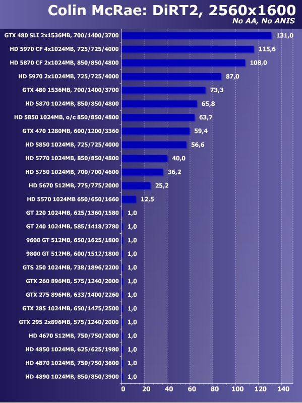 最高分辨率下,除HD 5770以外HD 5670也未能达到30帧的及格标准,各款显卡排名依然未变。