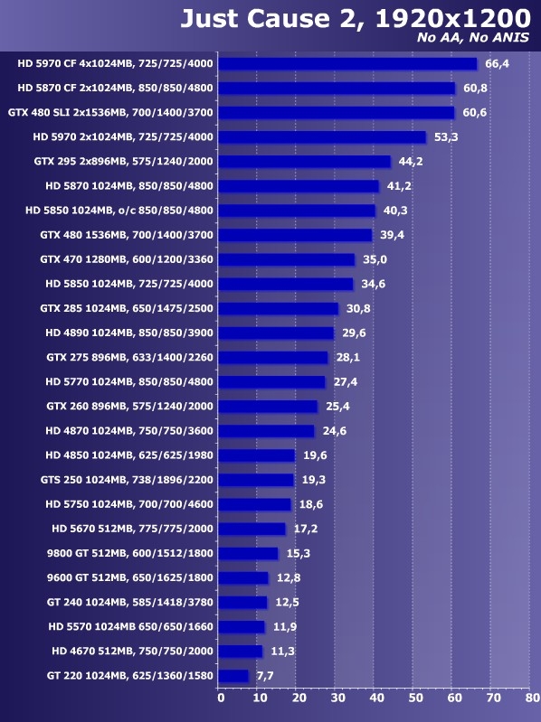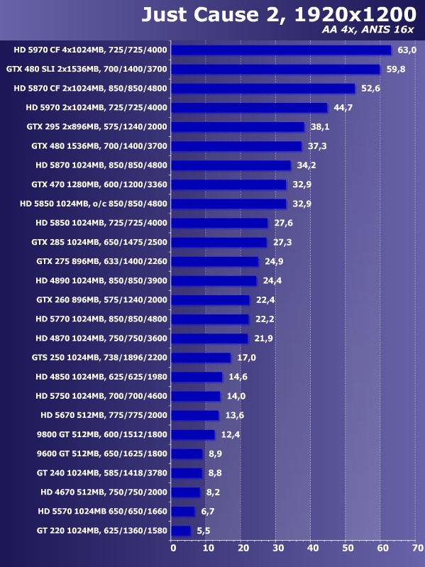 到了1920x1200分辨率,各款显卡帧数进一步下降,尤其是开启抗锯齿特效之后仅有HD 5970 CF和GTX 480 SLI勉强维持在60帧左右,所有单卡流畅度都不能令人满意,即便是GTX 480和HD 5870也仅仅能够保证基本的流畅度。