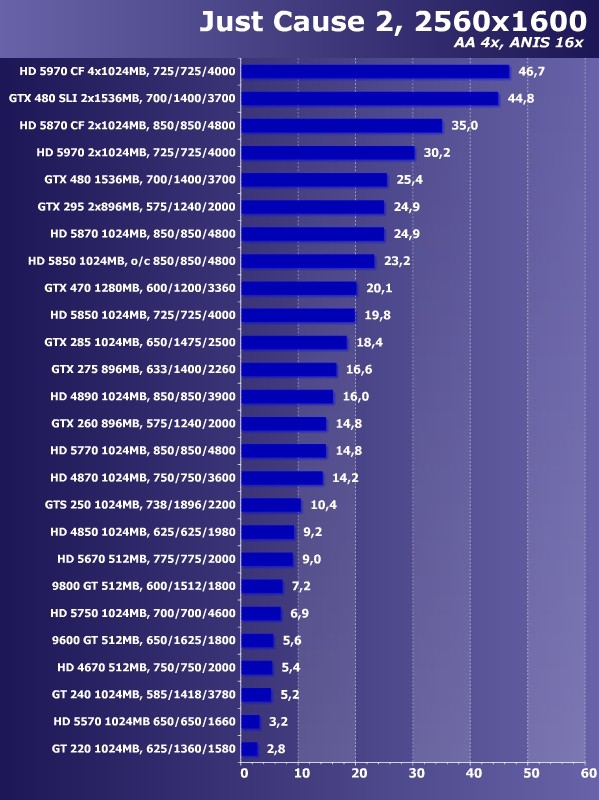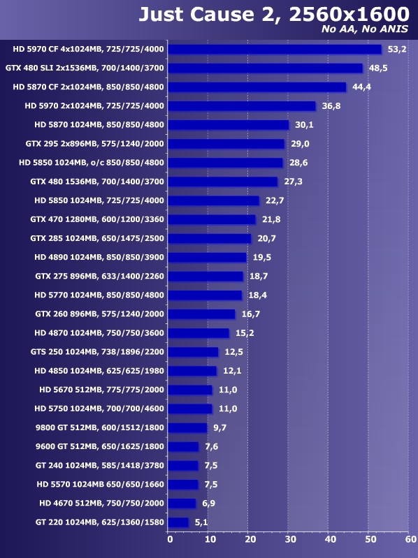 最高的2560x1600分辨率下,所有显卡都下降到60帧以下。不过HD 5970 CF依然排名第一,GTX 480 SLI紧随其后,其余各款显卡排名基本与前面一致。