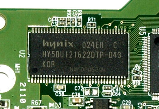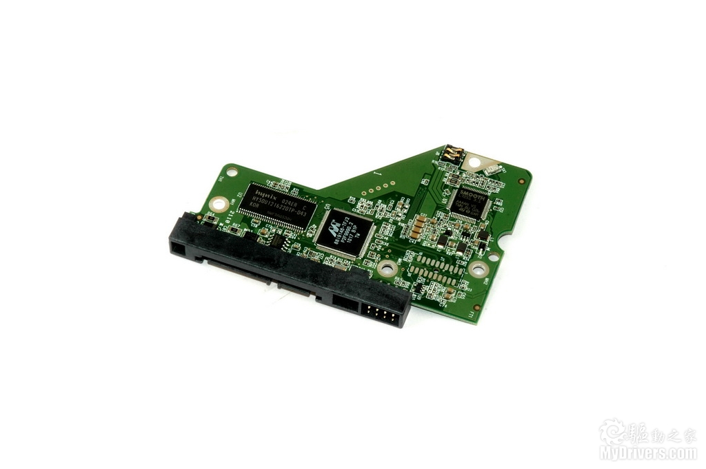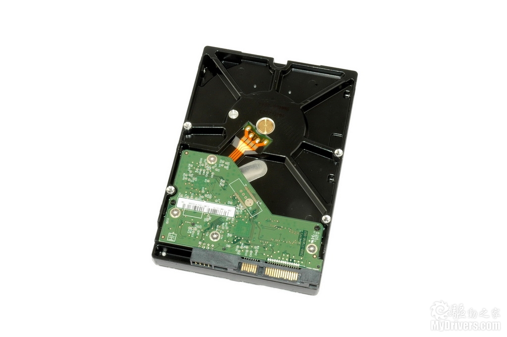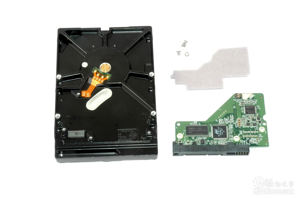 下面我们来看看这款硬盘的细节部分,拆下PCB可以看到PCB上的各种芯片和硬盘上的触点式结合部分,白色的海绵垫则对PCB有一定保护作用。