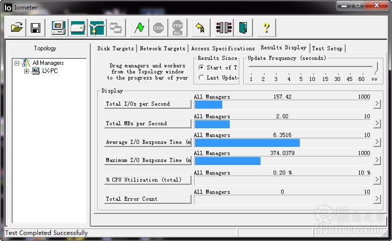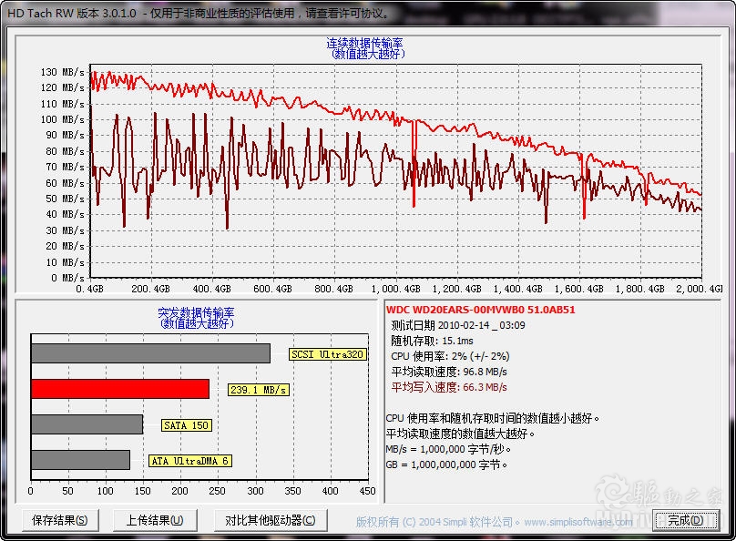 针对硬盘性能的测试中,IOmeter的测试成绩往往成为DIY玩家衡量硬盘性能的一个重要指标,这款软件可以对硬盘的IO性能指标做出评判,如上图中就对今天这款西部数据WD20EARS硬盘的IO能力给出了量化成绩。从最终成绩来看,这款硬盘平均IO响应速度可以控制在6ms,在同类产品中性能比较出众,同时测试过程中CPU占用率也仅为0.2%。
