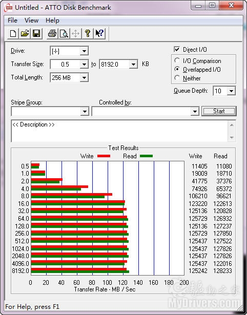 ATTO也是大家比较常用的测试软件,它可以通过测试读写不同长度文件来验证硬盘在不同情况下的读写性能,实际测试中文件大小超过16KB时便可以达到比较稳定的高速度, 最终成绩稳定在每秒125MB左右,而在这项测试中写入速度又出乎意料的高,随意我们还需要采用其他软件继续对读写速度进行测试,通过硬盘在不同软件下的表现确定其实际性能。