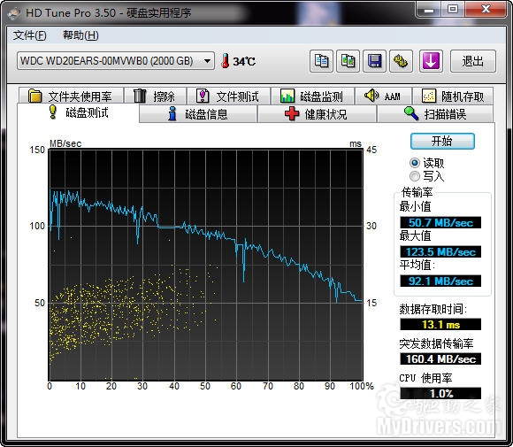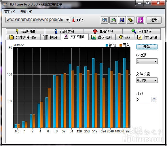 [基准性能测试二]下面我们则采用业内最常用的硬盘测试软件HD tune Pro测试一下这款WD20EARS硬盘的各方面性能,同时采用与ATTO类似的文件测试单项来重新验证一下读写性能。