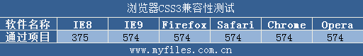 除了IE8之外,其它所有参评浏览器都完美通过了CSS兼容性测试,完全通过了574个具体测试,支持41种CSS选择器。IE8通过了20个CSS选择器测试,对1个CSS选择器的支持存在问题,另外20个则完全不支持,共通过了345个测试项目。
