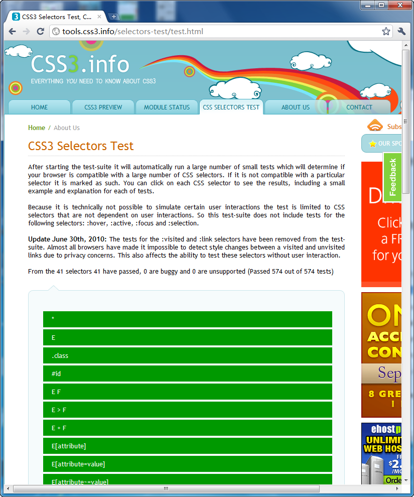 CSS3.info测试项目最近一次更新是在2010年6月30日,共包括41种选择器、574个具体测试内容。
