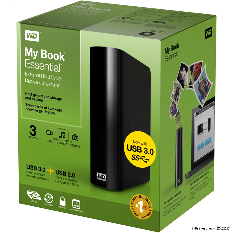 My Book Essential是全球最畅销的硬盘产品,拥有流线型外观和从1TB到3TB的超大容量选择,双重兼容USB2.0和USB3.0接口,并自带WD SmartWare可视备份软件。