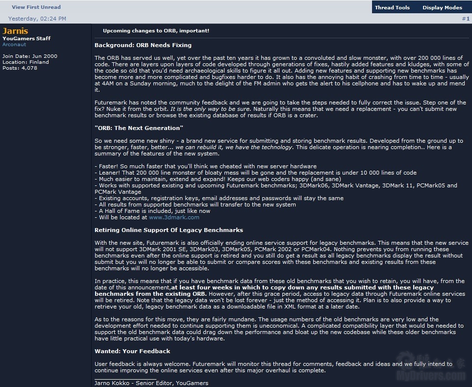 Futuremark日前通过论坛宣布,将对已有十年历史的ORB网站进行大规模升级,彻底重写后台程序,将源代码从20万行精简到1万行以下,实现更高的运行速度,并简化升级维护工作。