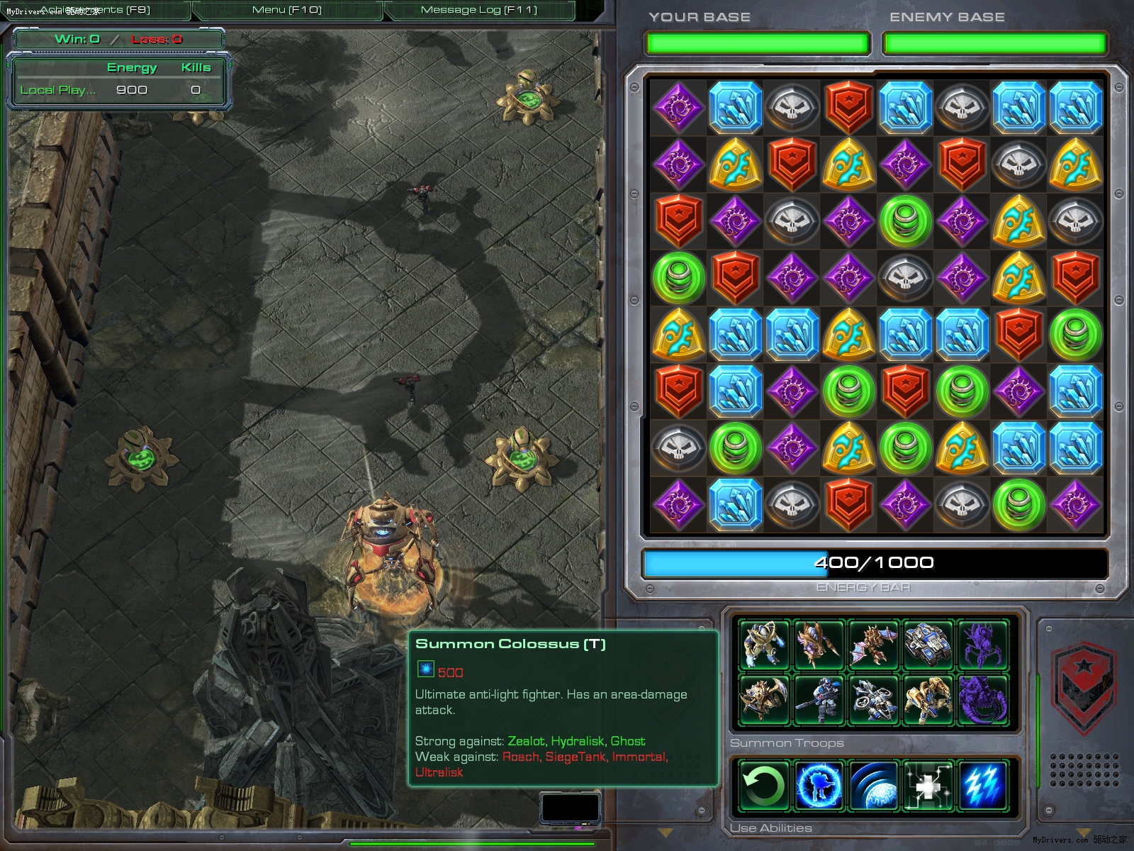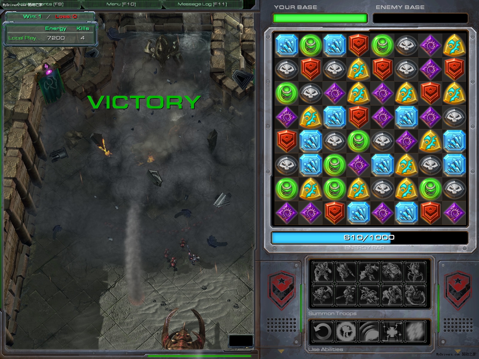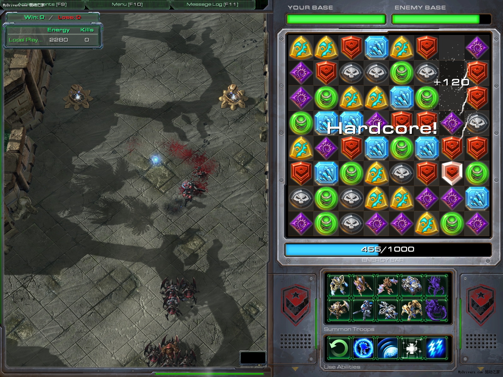 模仿PopCap Games的经典小游戏《宝石迷阵》(Bejeweled)。玩家需要找出相同的颜色的宝石来获得能量,用以训练部队去摧毁敌方基地,非常考验玩家的聪明才智。