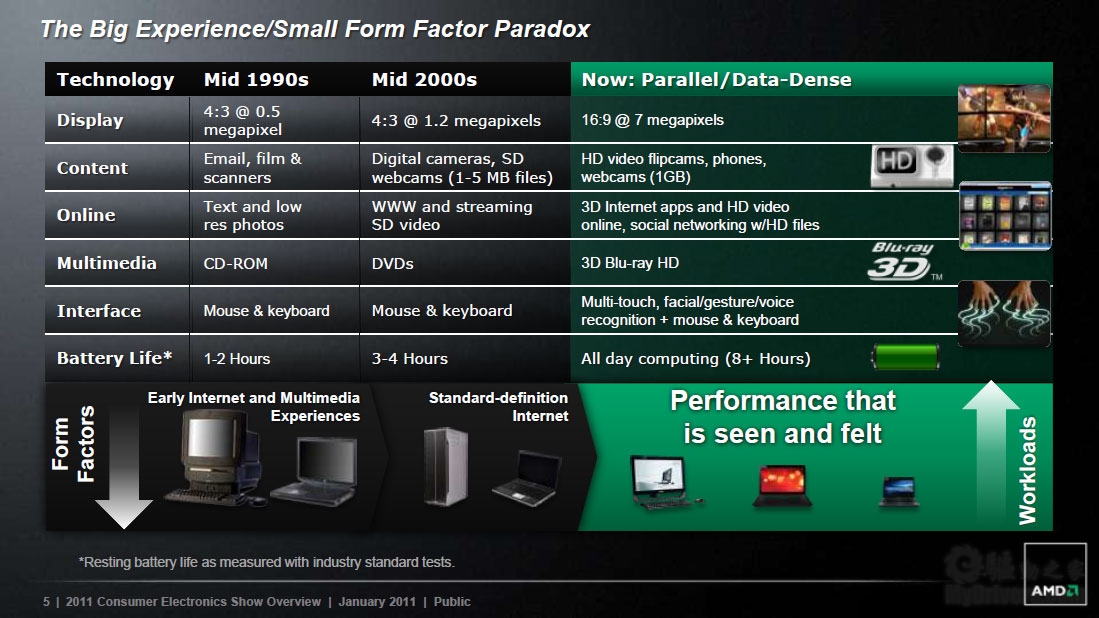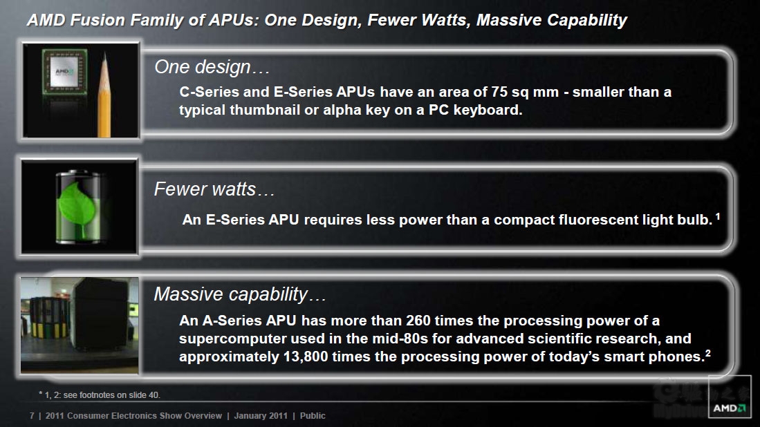 AMD Fusion APU:单一设计,面积比指甲盖或者键盘按键还小;更低功耗,耗电量不如一个荧光灯炮;强大性能,二十世纪八十年代科研超级计算机的260多倍,如今智能手机的将近1.4万倍。