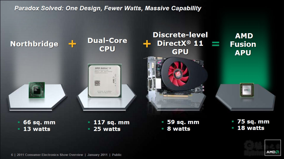 AMD Fusion APU确实是融合的产物,75平方毫米的面积里综合了北桥芯片、双核心处理器、独立显卡级DX11 GPU,热设计功耗则最高仅有18W。