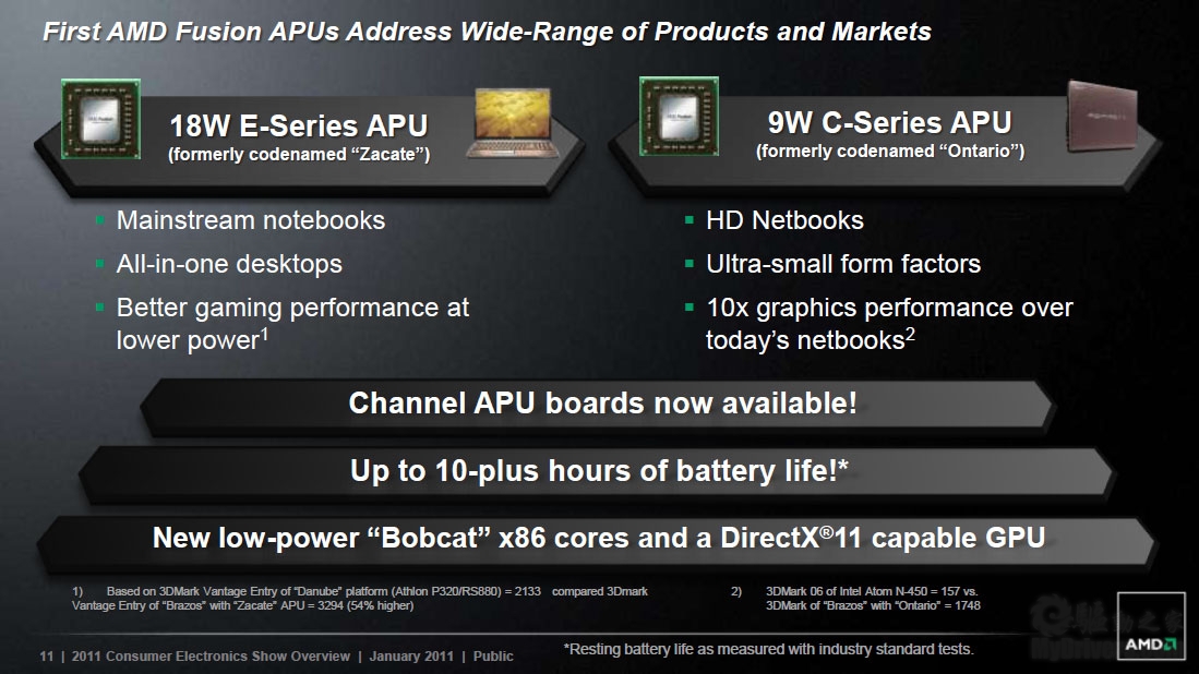 Zacate E系列面向主流笔记本、一体机,提供一定的游戏性能;Ontario C系列则面向高清上网本、超小型设备,号称图形性能是Atom上网本的最多十倍。