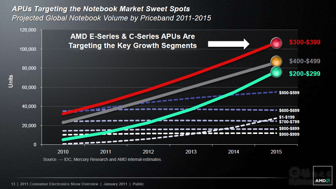 E/C系列APU主攻的是300-399美元价位笔记本,也是AMD认为最具增长潜力的地方。