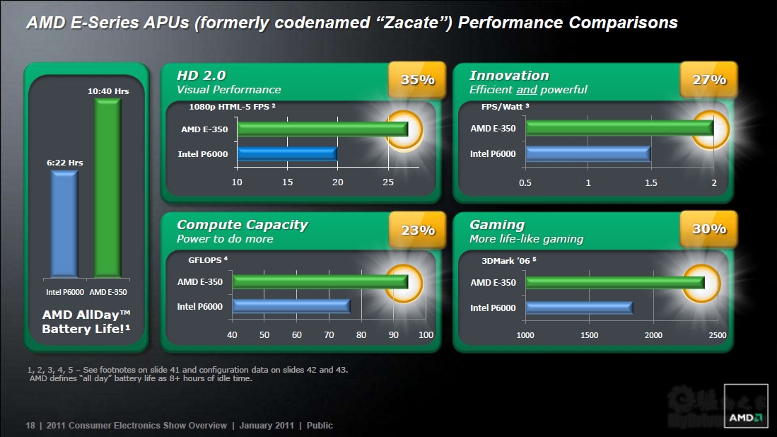 Zacate E-350则要面对Intel Pentium P6000,以上是高清视频、性能功耗比、计算能力、3D性能对比。
