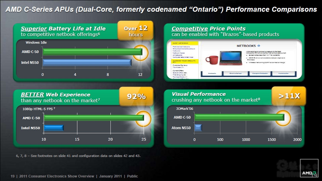 Ontario C-50的主要竞争对手是Intel Atom N550,以上是AMD有关二者电池续航、价位、高清视频、3D性能的对比。
