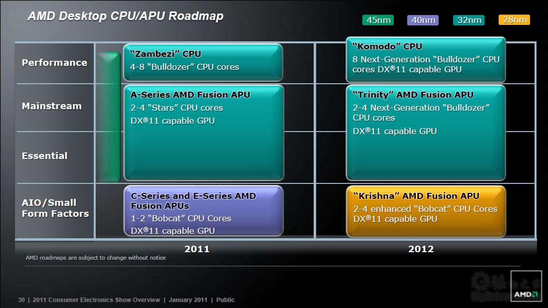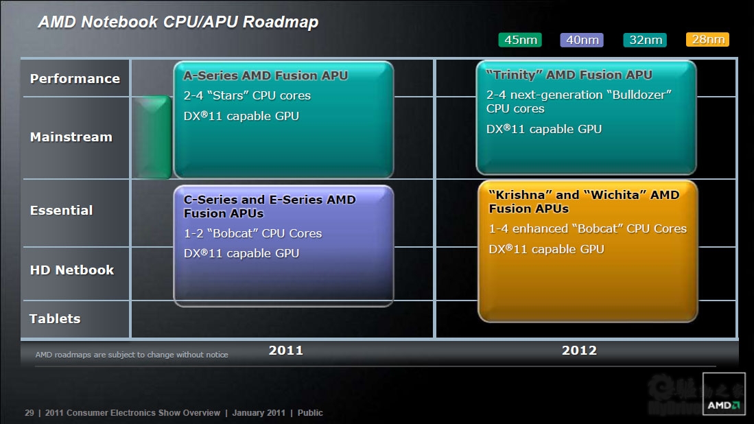 下边是几张路线图。代号Llano的高性能版Fusion APU将在今年年中发布,命名为A系列,用于主流台式机和笔记本,并且明年引入推土机架构,制造工艺则都是GlobalFoundries 32nm。C/E系列明年同样全面增强,核心数最多四个,制造工艺也升级为台积电28nm。