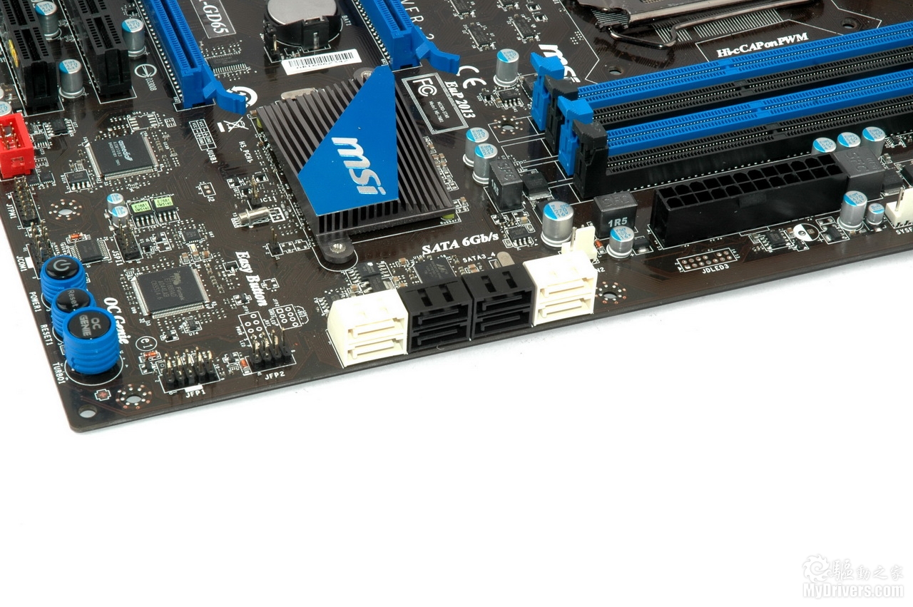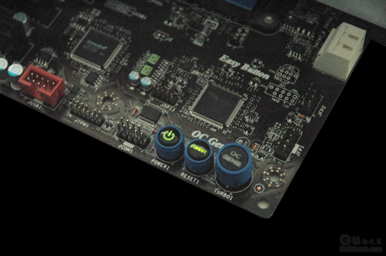存储部分,可以看到一共有六个SATA接口,其中四个白色的是SATA 6Gbps接口。左侧提供了三个微动开关,其中包括电源键和重启键,最靠右侧的那个则是第二代超频精灵技术的开关,通过在关机状态下打开这个开关,用户可以实现即时超频,非常方便,不需要用户有任何超频知识。