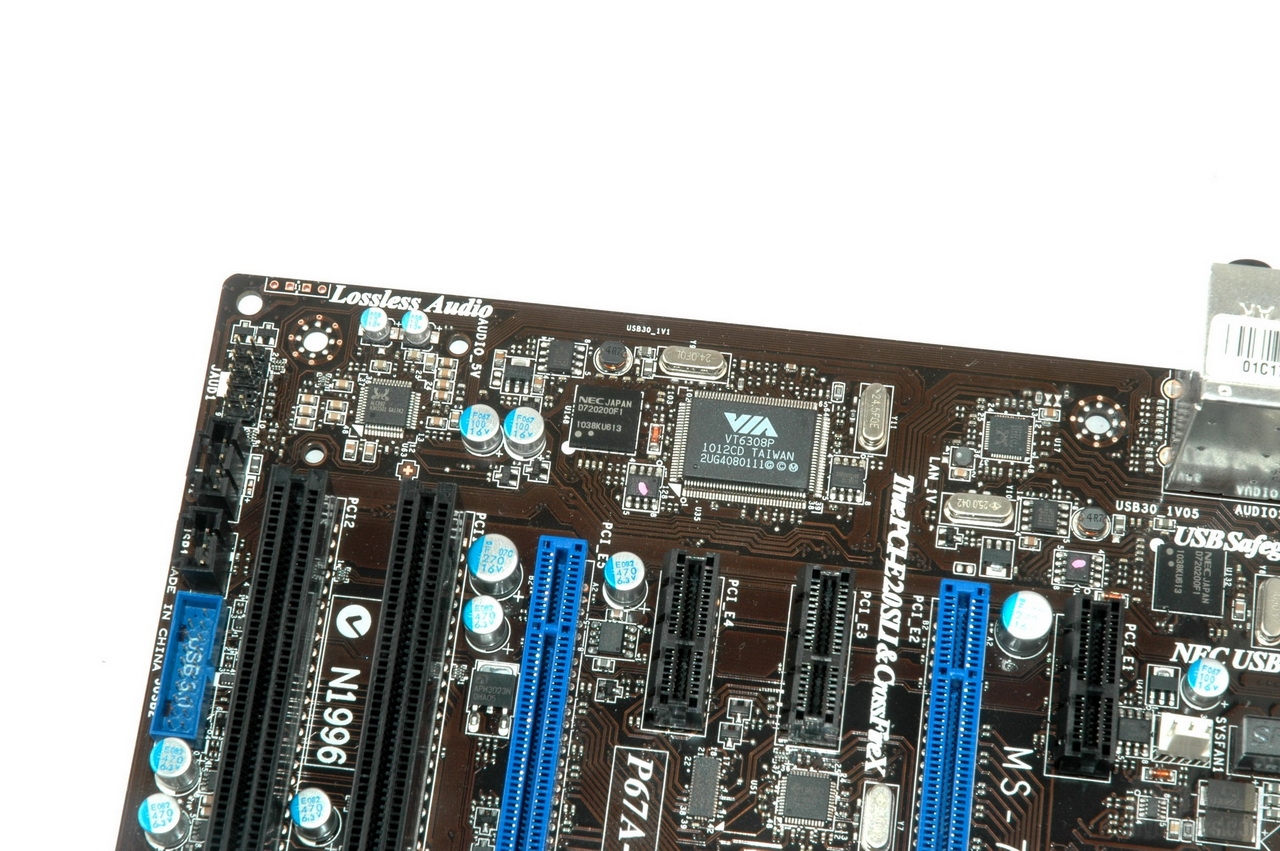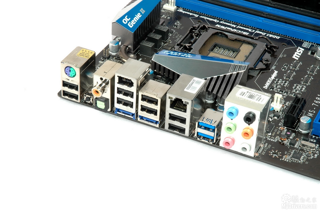 背板接口非常丰富,这个部分提供八个USB2.0接口和两个USB 3.0接口,同轴输出和光纤输出,六口音频输出,IEEE1394、eSATA接口,RJ45网线接口和清CMOS按钮。