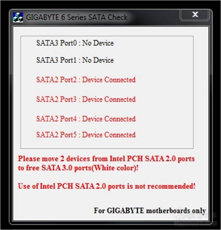 为了帮助用户们在6系列主板上优化SATA的性能,技嘉科技特别推出了一个易于使用的程序,名为GIGABYTE 6 Series SATA Check,它可以告诉您是否正在使用受影响的英特尔PCH SATA 2.0接口。如果是,它还会建议您更改您的SATA设备到白色的SATA 3.0接口。该程序是可以用在任何6系列芯片主板的简单程序,并为用户提供3种可能情况的不同建议,用于配置他们的SATA设备。
