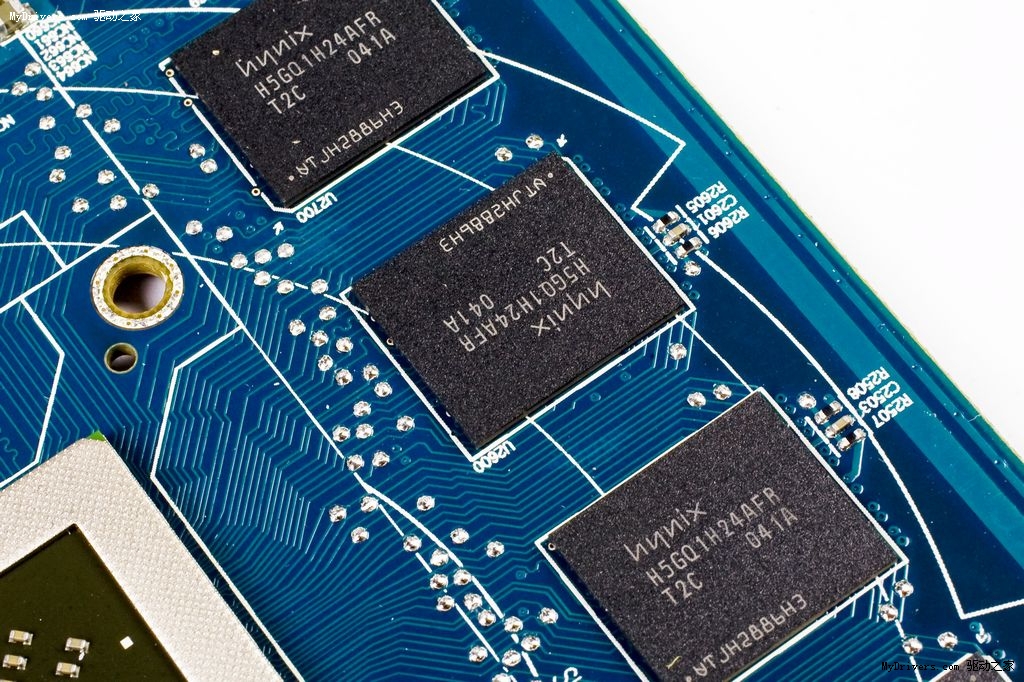 显存设计方面,由于被散热器覆盖了无法查看到。咨询镭风工程师后得知,这款显卡采用了海力士H5GQ1H24AFR-T2C显存,这是一款GD5 0.4ns的极品极速显存芯片,等效频率为5000MHz。不过默认频率仅为4000MHz,显存的可超频空间颇大,整卡8颗芯片组成256bit 1024MB显存规格。