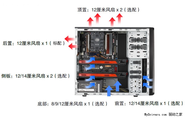 为更好提升散热性能,特警371机箱采用最新的电源下置结构及垂直风道设计,给机箱内部提供最佳的风流。不仅如此,机箱上、下、前、后及侧板共设计了7个风扇位,用户可以根据自己的实际需要选择安装,配合机箱前面板的冲孔网设计,为你的机箱内部系统提供更好的散热效果。