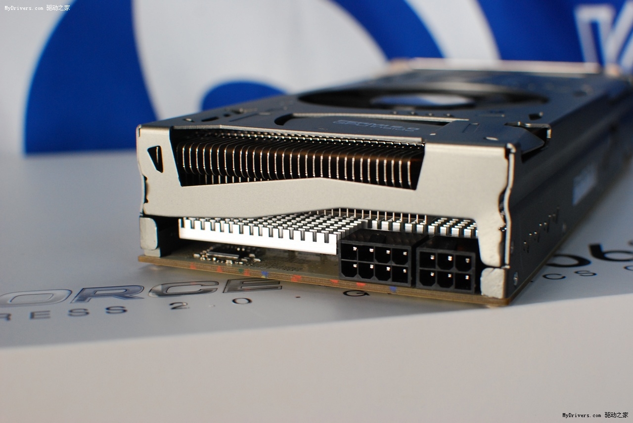 GTX560 Ti HOF强劲之处在于采用Volterra全数字供电技术,6+2相供电及全钽电容设计,其中核心供电为6相全数字供电,显存则采用2相供电。核心供电方案由VT1185M主控芯片、6颗VT1157SF从控芯片以及Bussmann CPL排感组成,每个供电环节都保持极高的开关频率,工作温度可耐200摄氏度高温,在极限超频环境下,数字供电无疑具有更大的优势。该显卡并没有采用大部分GTX 560 Ti显卡常用的双6pin供电接口,而是辅以供电能力更强的6pin+8pin设计,让显卡运行更为稳定。