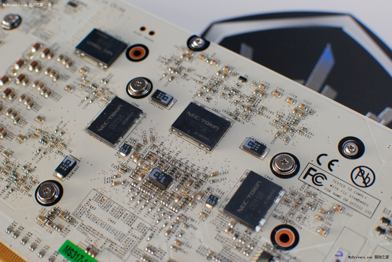 由于开关频率的提升,因此显卡用料极为奢华,除了采用大量MLCC电容,多颗POS CAP电容外,在PCB背面核心附近搭载了四颗NEC Proadlizer高速薄膜式去耦电容,拥有优秀的高频能力,容量甚至超过传统电容但ESR更低,可大大降低电源噪音,其较高的蓄电量以及高速的充放电效率亦可有效提升显卡超频能力与运行稳定性。