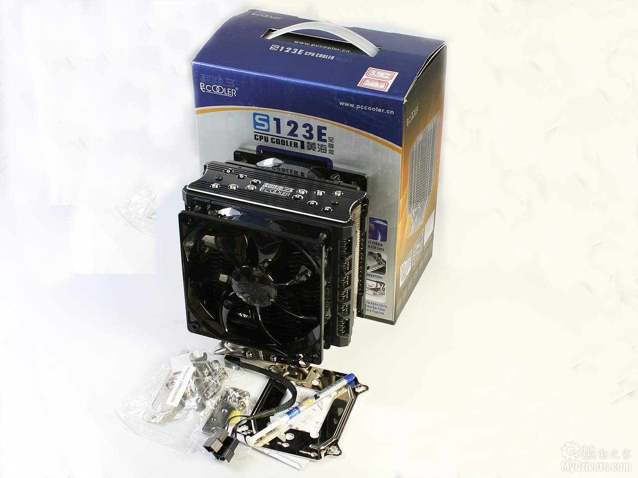 【散热器赏析】黄海至尊版开箱全家福,搭配的附件非常齐全,提供对Intel LGA775/115x/1366与AMD AM2/AM2+/AM3平台的支持。产品三维尺寸为157×144×110mm,全重为1070g,又是一款重量级产品。