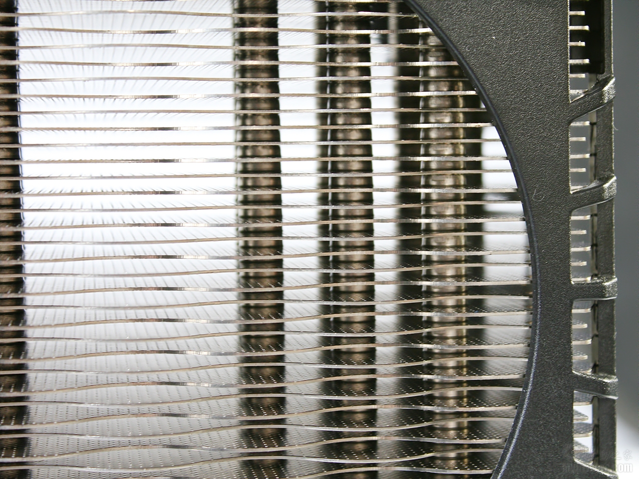 铝质散热器鳍片没有简单的采用平行分布设计,搭配了最近超频三经常采用的鱼鳞式鳍片处理方式,鳍片成波浪型交错。可以有效降低风阻稳定气流并因此减小风噪,另外在鳍片表面均衡分布了突起点,可以让流经的风产生一定紊流从而增加利用率。不过就编辑看来,其最大的特点莫过于增加了鳍片的散热面积。