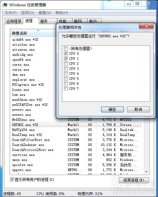 系统满载方面,我们采用了Orthos软件,值得注意的是,在使用Orthos填满6个物理核心时需要在任务管理器中——进程——设置相关性来设置,否则无论你开多少个Orthos也不可能令6个逻辑核心完全100%占用率的。