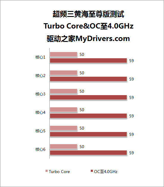 处理器频率提升的同时,处理器温度也水涨船高,当开启Turbo Core时,CPU温度一度拉升至50摄氏度,而OC至4.0GHz时,温度则跃升至59摄氏度。虽然在频率提升情况下的成绩的确不如默认频率下优秀,但AMD高端6核心处理器TDP高达125W,其发热量的确不容小觑,令编辑比较满意的是,即使在OC至4.0GHz情况下,温度始终控制在60摄氏度以下,这样的表现完全可以让人接受。