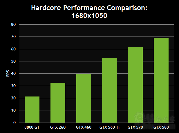 GTX 560 Ti实力不俗,1680×1050分辨率下高达52.8FPS,提高一个档次也有42.6FPS,继续提高仍能超过25FPS。