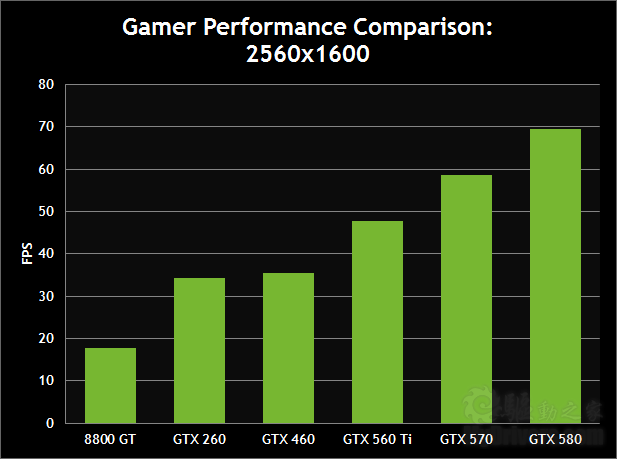 GTX 500系列仍然比较轻松,即使是GTX 560 Ti在2560×1600分辨率下也能跑出38.3FPS,最高端的GTX 580更是达到了55.5FPS。