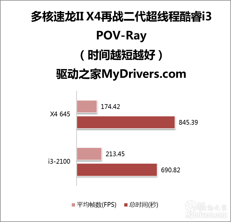 POV-Ray对多核心、多线程的优化也是比较到位的,这次酷睿i3-2100终于赢了一回,抢先150多秒完成测试,可能是得益于Sandy Bridge架构和指令集的改进以及超线程对该软件更好的支持。